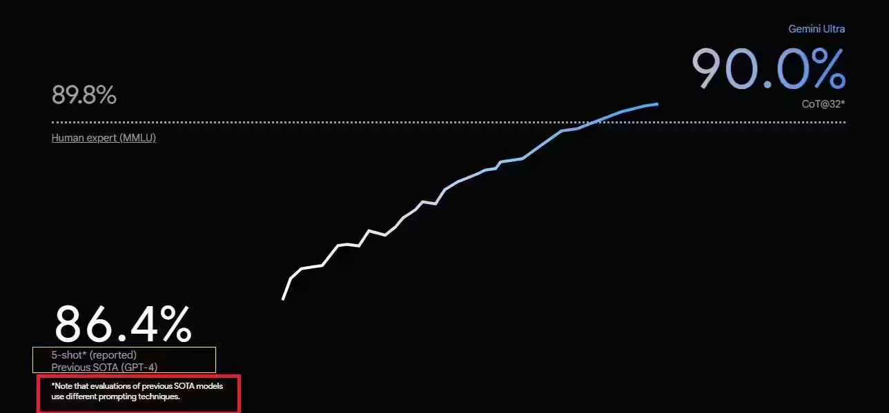 Gemini Ultra's score was based on a "chain-of-thought with 32 samples" method, which differs from the 5-shot technique.