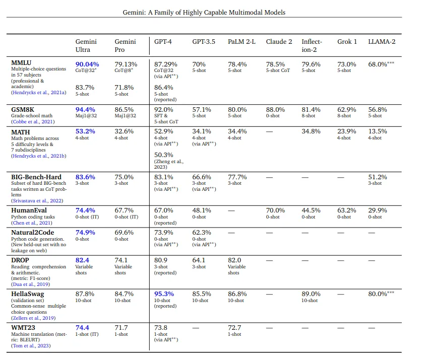 When both models were assessed using the 5-shot MMLU technique, GPT-4 scored 86.4 percent, while Gemini Ultra scored lower at 83.7 percent.