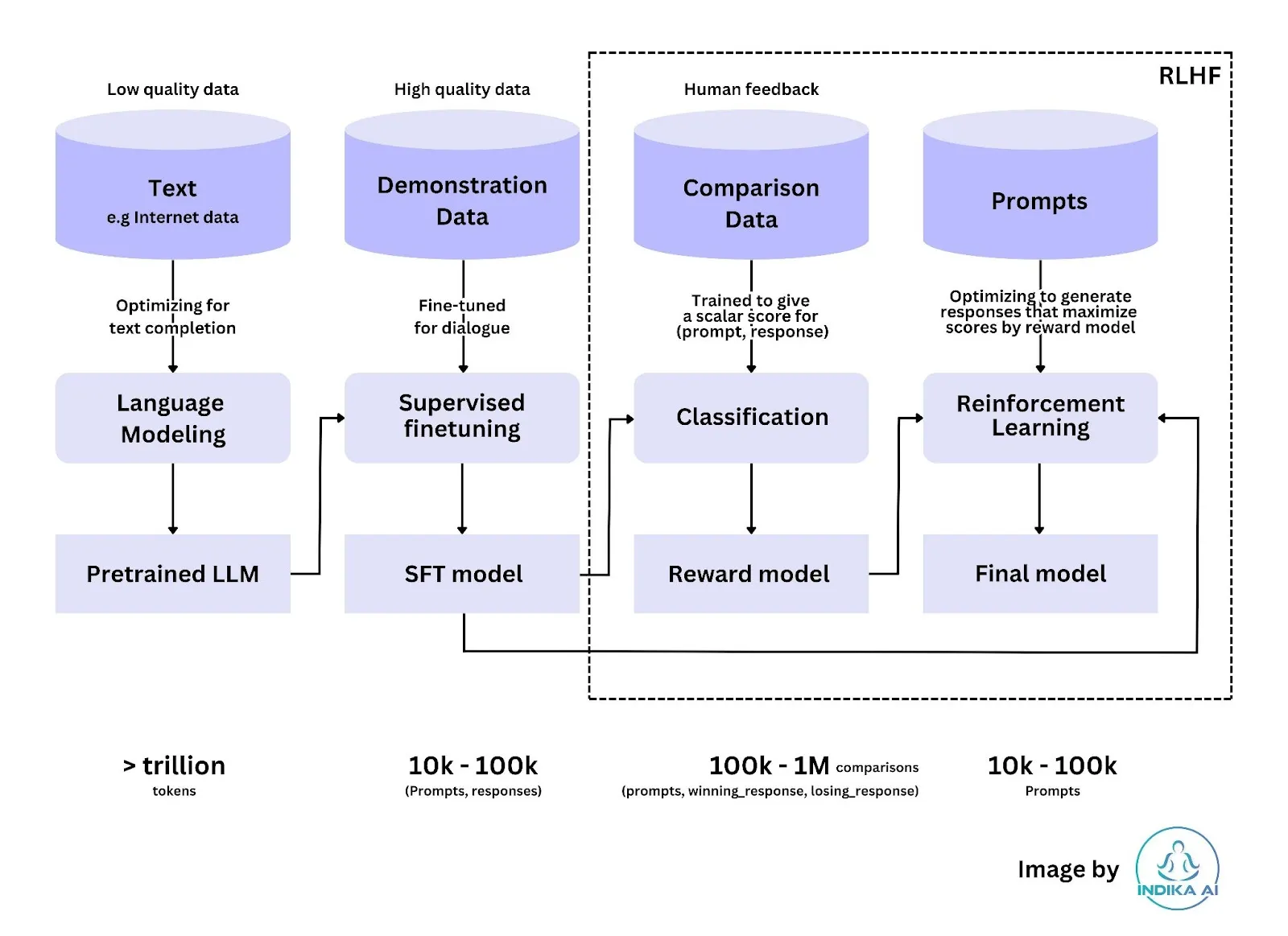ChatGPT is a dialogue-optimized LLM. The training method of ChatGPT is similar to the steps discussed above. It includes an additional step known as RLHF apart from pre-training and supervised fine tuning.