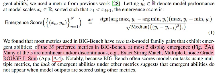 To look into the first, the authors tried to quantify emergent ability. By analyzing their results, we see that 2 metrics account for > 92% of claimed emergent abilities: Multiple Choice Grade and Exact String Match. Multiple Choice Grade is discontinuous, and Exact String Match is nonlinear.