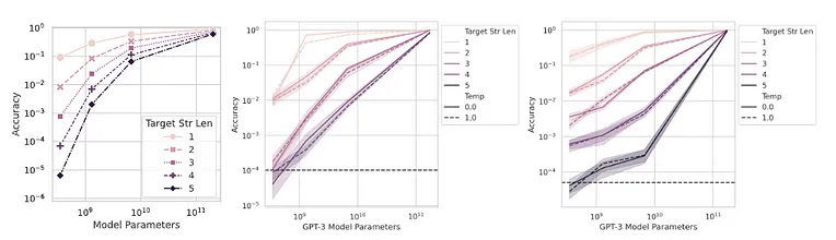 Onto the second prediction. To accurately measure the models’ accuracy, the authors increased the resolution by generating additional test data. By doing so, they found that on both arithmetic tasks, all models in the InstructGPT/GPT-3 family performed better than random guessing (Fig. 4). This confirms our second prediction. We also observe that as the target string length increases, the accuracy falls approximately geometrically with the length of the target string, confirming the second half of our third prediction.